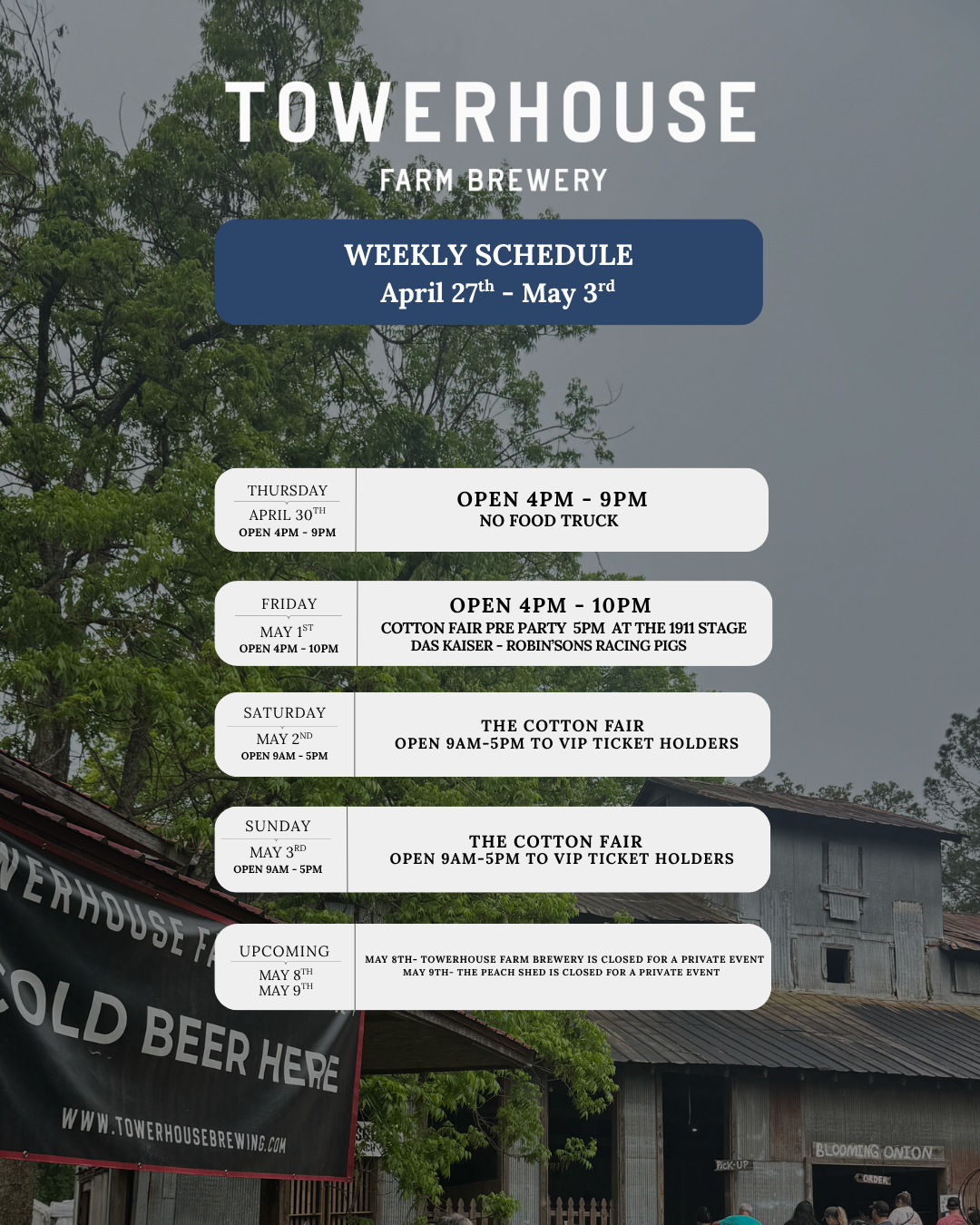 Join us as we celebrate The Cotton Fair Weekend! We are kicking things off with A Pre Party Friday, May 1st with Das Kaiser At TFB and new to The Cotton Fair, Robin’sons Racing Pigs. (Yes, they are racing pigs!)